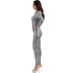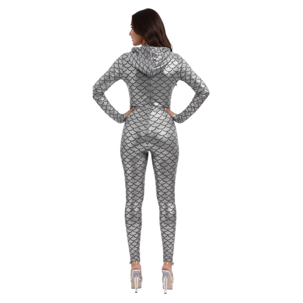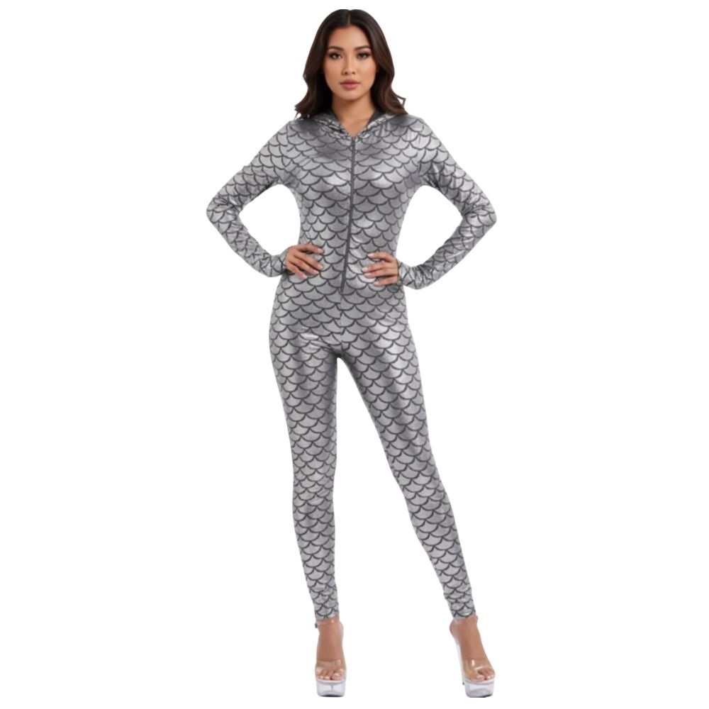 אוברול קשקשים כסוף ומבריק בסגנון פנטזיה מודרנית, מושלם לפורים, מסיבות, צילומי תוכן, ריקוד והופעות.