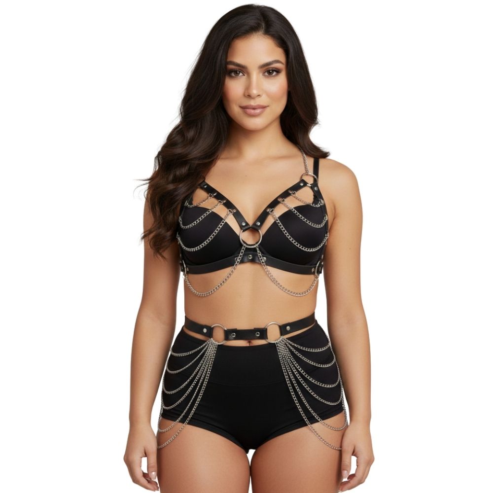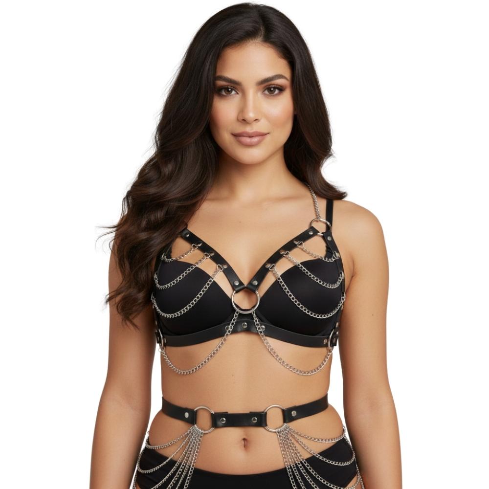 הטופ כולל עיצוב ייחודי משולב שרשראות מתכת בשילוב רצועות דמוי עור, שמעניקות מראה יוקרתי, מדליק וסקסי במיוחד.