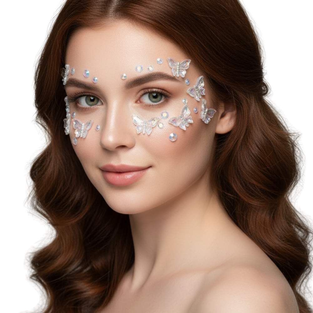 סט יהלומי פנים בעיצוב פרפרים עדין וזוהר – מושלם לפורים, פסטיבלים ולמסיבות.