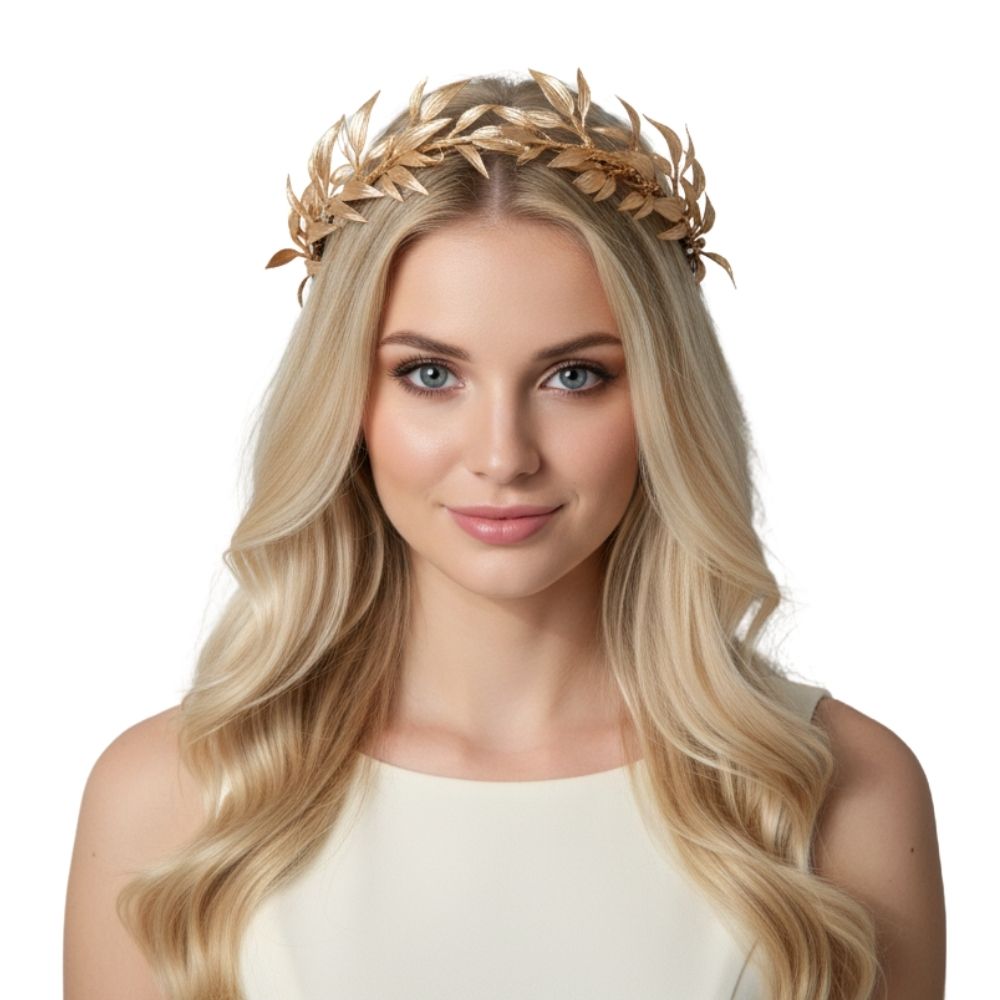 עיצוב רומאי קלאסי: נזר בעבודת יד בעיצוב עלי זהב מעודנים, בהשראת הכתרים של קיסרי רומא.