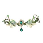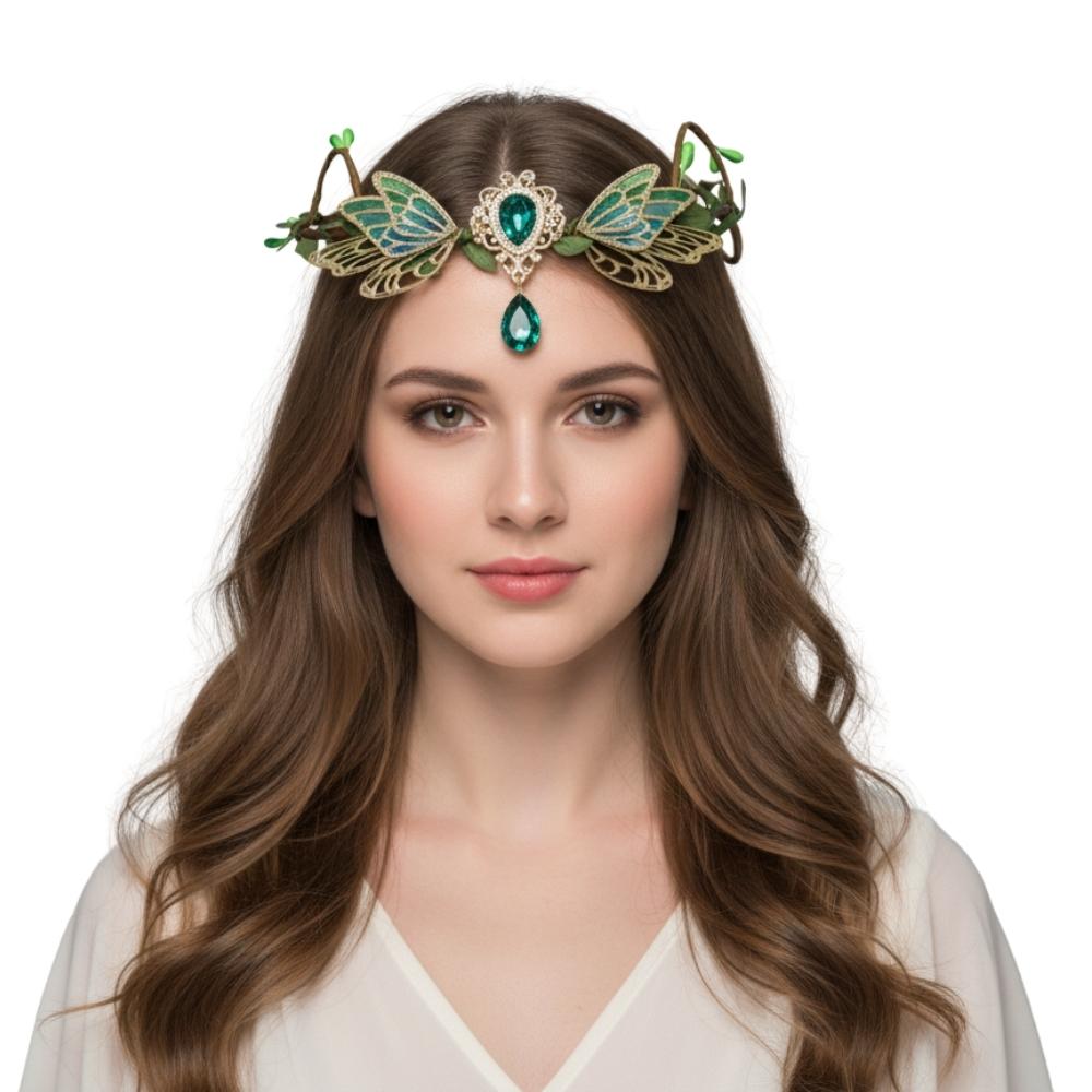 👑 נזר מלכותי קסום עם כנפיים ואבן ירוקה – מראה מהפנט של פיית היער