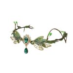 נזר אלגנטי ומרשים בעיצוב אמנותי של כנפיים מוזהבות ואבן ירקן נוצצת, בשילוב ענפי גפן עדינים המשולבים בעלי בד רכים.