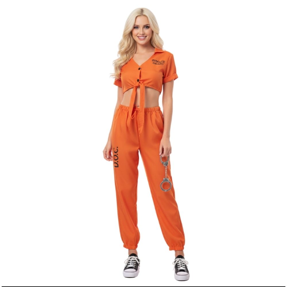 תחפושת אסירה כתומה לנשים, בעיצוב חדשני, מחמיא ונוח שמביא שילוב מדויק בין קריצה שובבה ללוק מגניב וקליל שמתאים לכל מסיבה.