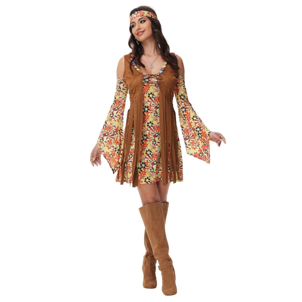 התחפושת ההיפית הזו מביאה איתה את כל הוייב המושלם של שנות ה-70 – שילוב מושלם של שמלת פרחים צבעונית, אפוד פרנזים מחמיא וסטייל שאי אפשר להתעלם ממנו.