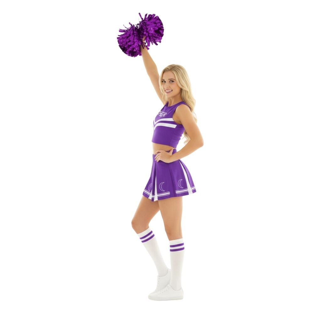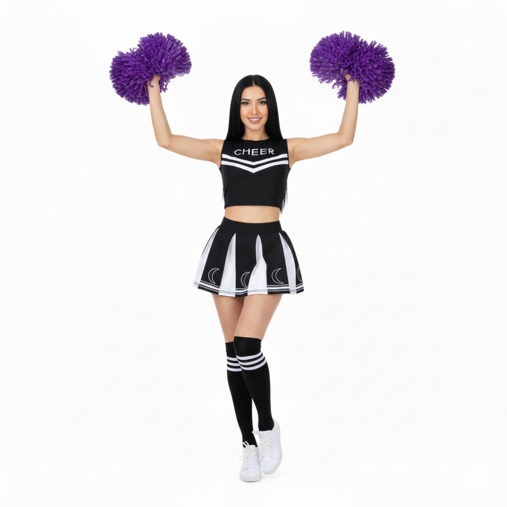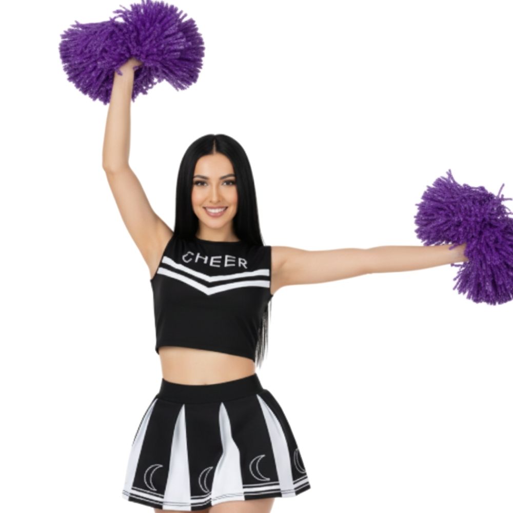 תחפושת מעודדת נשים מעוצבת ומלאת סטייל, שמגיעה כסט שלם הכולל חצאית פליזה איכותית, טופ תואם עם כיתוב CHEER, זוג פונפונים נוצצים וגרביים תואמות – הכל ליצירת לוק מנצח שאי אפשר להתעלם ממנו!