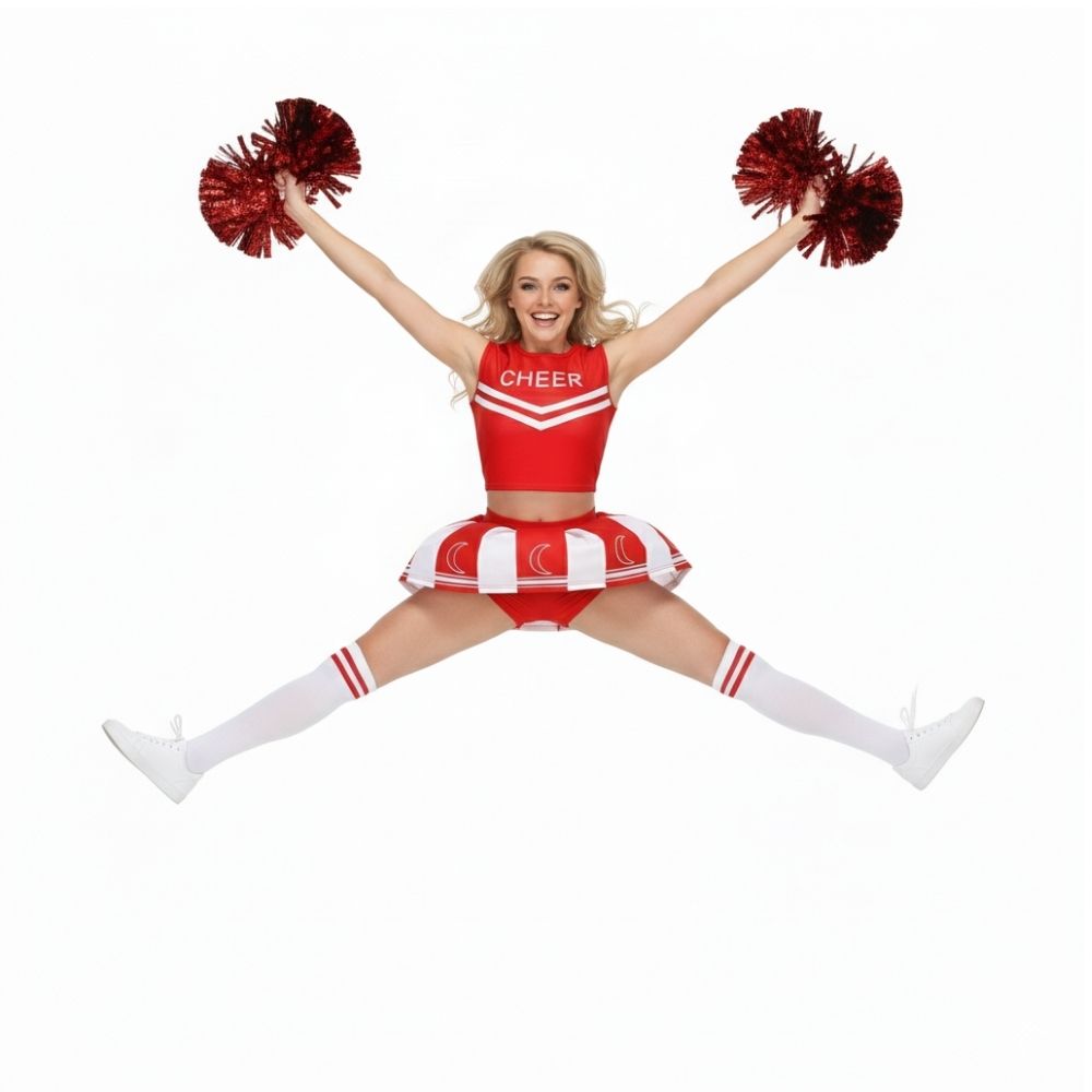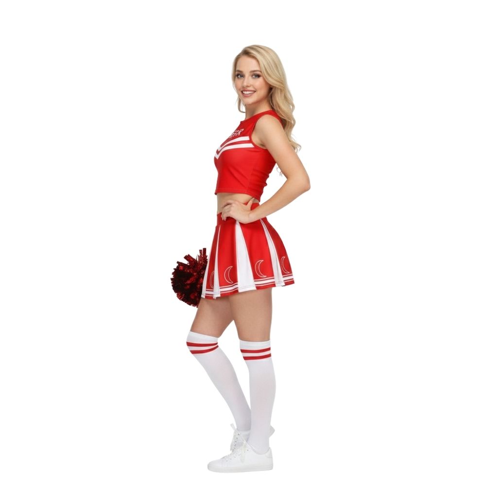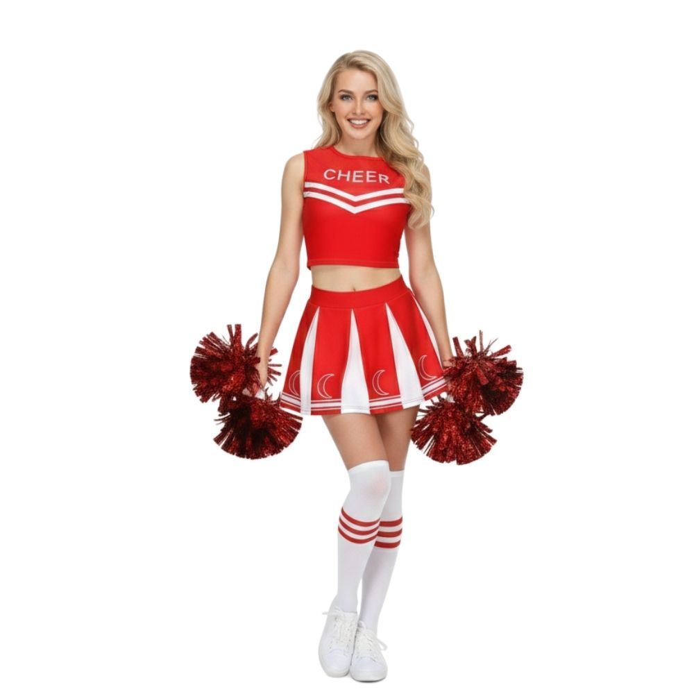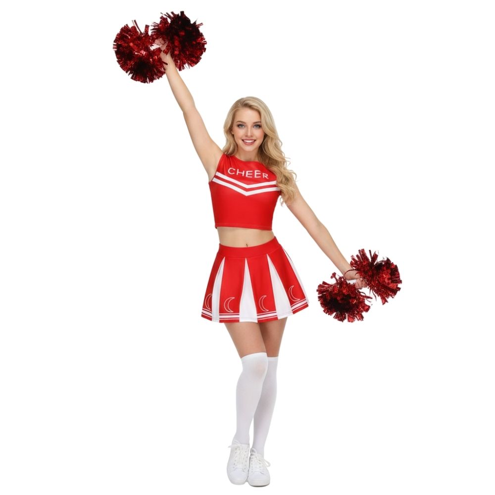 תחפושת מעודדת נשים מעוצבת ומלאת סטייל, שמגיעה כסט שלם הכולל חצאית פליזה איכותית, טופ תואם עם כיתוב CHEER, זוג פונפונים נוצצים וגרביים תואמות – הכל ליצירת לוק מנצח שאי אפשר להתעלם ממנו!
