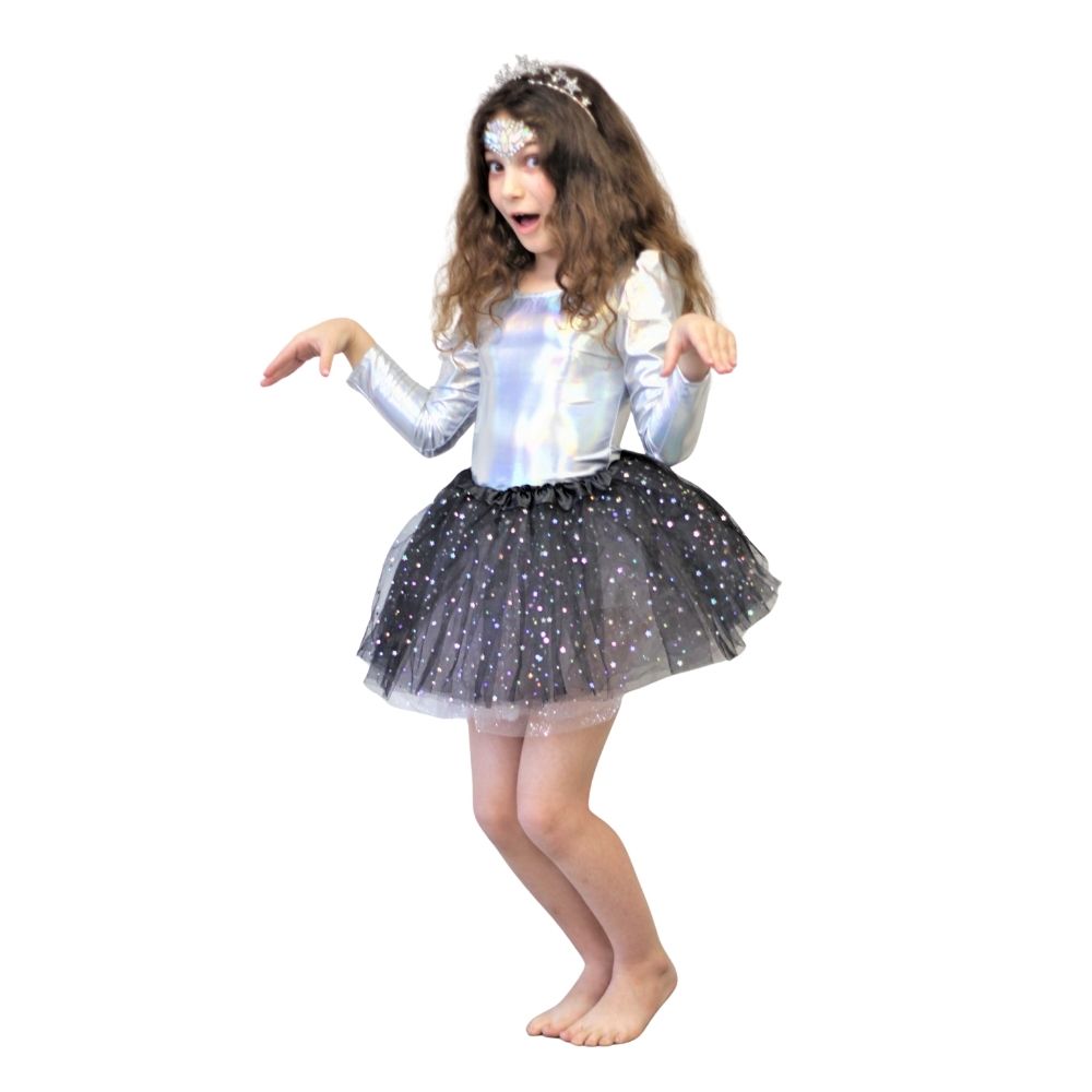 לטוטל לוק מושלם ניתן להוסיף :טול ארוך כסוף עם כוכבים, מדבקות אבנים כסף , אקדח חייזר , שימו לב! הילדה בתמונה לובשת 2 חצאיות למראה מנופח ויפה יותר מומלץ להוסיף טוטו לבן מתחת.