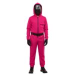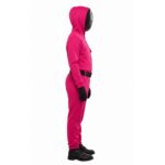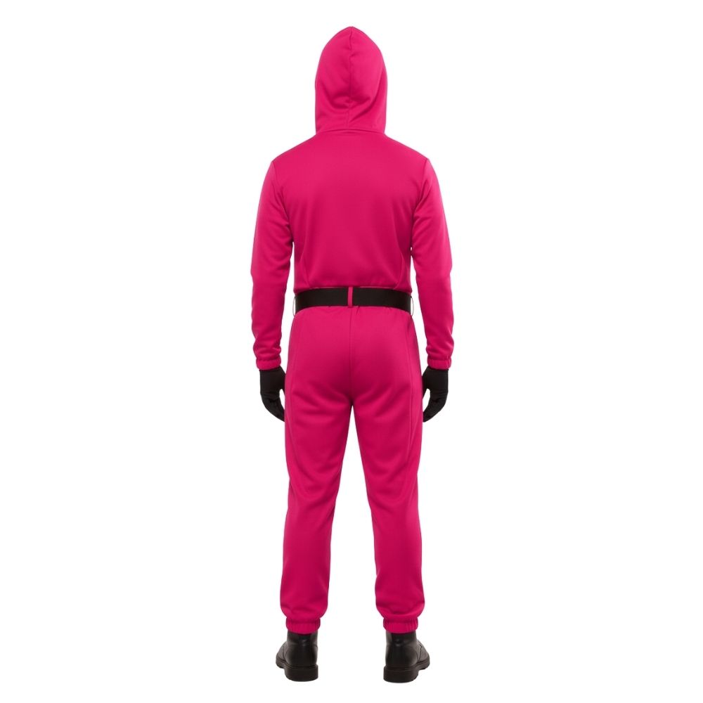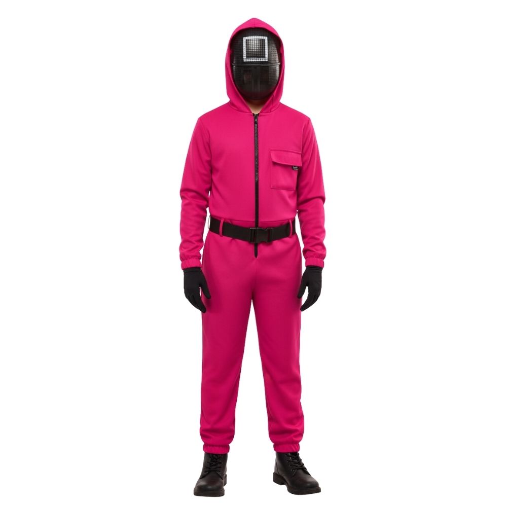 אוברול ורוד עם קפוצ׳ון, חגורה ומסכה עם סמל גאומטרי יוצרים מראה אחיד, מסתורי ומרשים שמיד מזוהה.