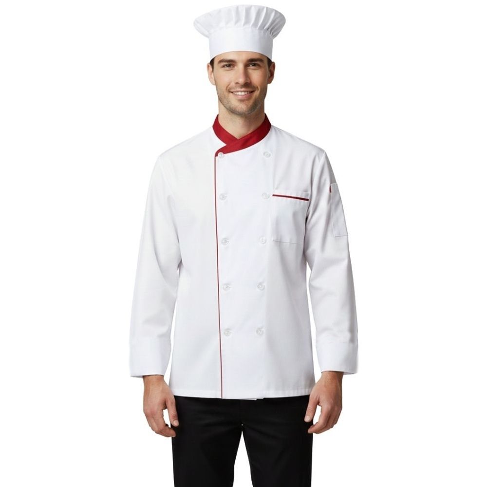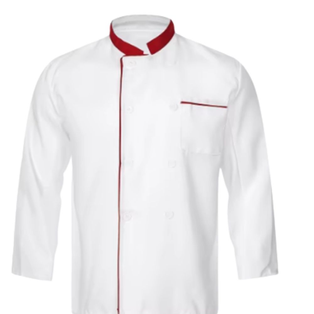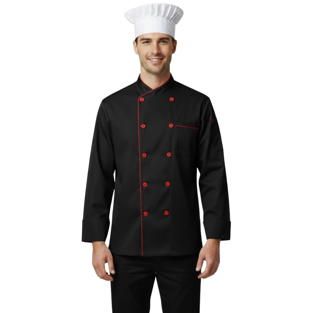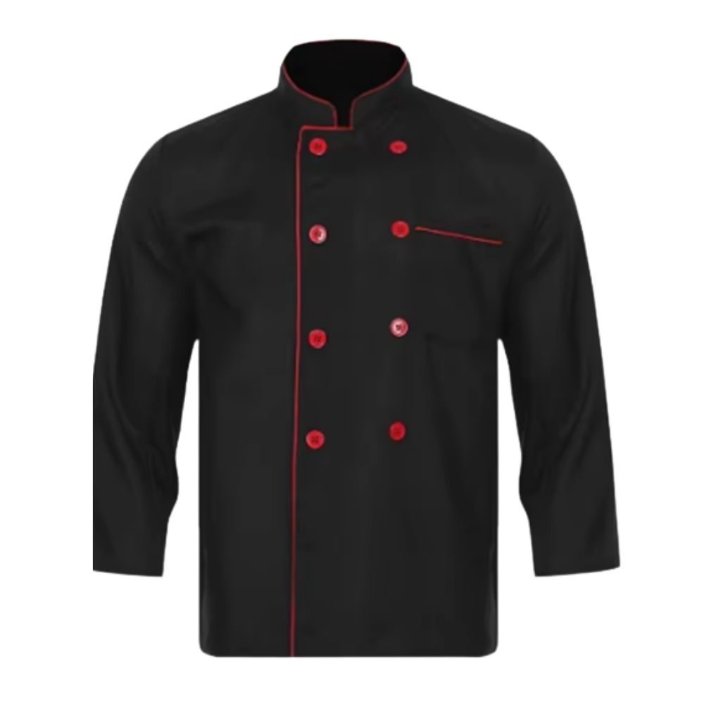 ג׳קט שף בעיצוב פרימיום עם כפתורים כפולים, תפרי דקורציה בצבע אדום ושיק קולינרי שאי אפשר להתעלם ממנו.